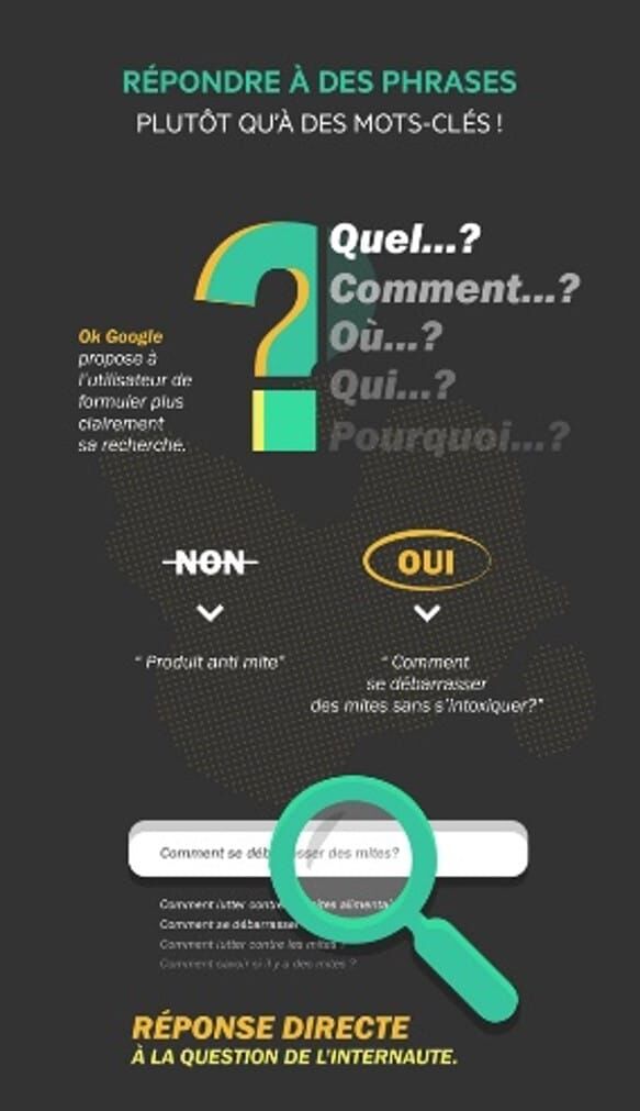 Vous devez donc être plus attentif dans le choix de vos mots-clés. Et pour vous aider, il vous suffit de vous poser la question suivante: comment une personne poserait cette question s’il parlait au lieu d’utiliser son clavier?.