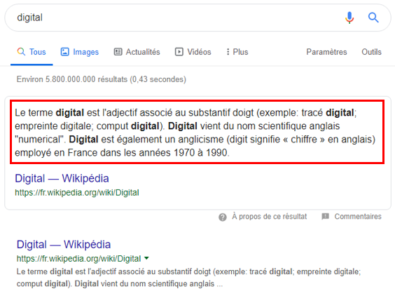 La position zéro ou “featured snippet” est la position qui se trouve au-dessus du premier résultat: c’est un petit extrait de la réponse. C’est une façon rapide d’avoir la réponse sans cliquer sur le lien. C’est la raison pour laquelle, il faut optimiser son site web pour la position zéro. Et pour ce faire, il faut que vous répondiez à la question posée de façon très claire et simple, de décomposer votre contenu en plusieurs parties et d’utiliser aussi des images, des vidéos ou des infographies, ou bien d’utiliser une liste de points ou étapes ou conseils, autrement dit, numéroter votre contenu.